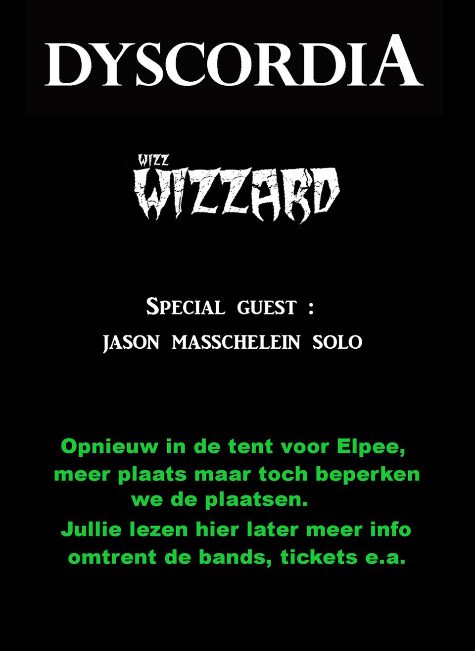 Vorig jaar was zondag een familie dag, dat is nu eigenlijk niet veel anders. Met op de affiche twee acts die ondertussen veel respect krijgen binnen het wereldje van metal, rock en aanverwanten. Wizz Wizzard is niet alleen organisator van het bekende Wizzfest - dat doorgaat op 19 maart 2016 - maar ook een begenadigde zanger, artiest en heel beminnelijke persoonlijkheid. Bovendien staat hij vaak achter de draaitafels het geluid te regelen op concerten van andere bands. Als Wizz achter die tafels staat, kan je er zeker van zijn dat het geluid perfect zal zijn bij dat optreden. Maar ook heeft hij ondertussen met zijn band knappe platen uitgebracht, en zijn optredens van Wizz Wizzard onvergetelijke momenten, waarvan elk beetje liefhebber van het pure Heavy Metal genre gaan watertanden. De uit Kortrijk afkomstige Progressive metal band Dyscordia sluiten perfect aan bij de voornoemde act. Ook zij brengen hun muziek vanuit het hart, en hoeven daarbij geen show te verkopen of overdreven poses aan te nemen. Nee, gewoon puur en onversneden metal, of rock zoals je wil, zonder fransjes. Dat boden ze ons recent nog aan op het festival Rebelrock in Genk. Ook op vijf jaar Elpee in Deinze zal het een wervelend feestje worden, waar alle heavy metal fans van het eerste tot het laatste uur, met volle teugen zullen van genieten. Als klap op de vuurpijl is er deze avond een special guest: Jason Masschelein, voormalige gitarist bij de Belgische Black/thrash metal band Demonizer hoeven we wellicht niet meer voor te stellen? Kortom een avond om dit feestje 'vijf jaar Elpee' met het nodige vuurwerk af te sluiten.
