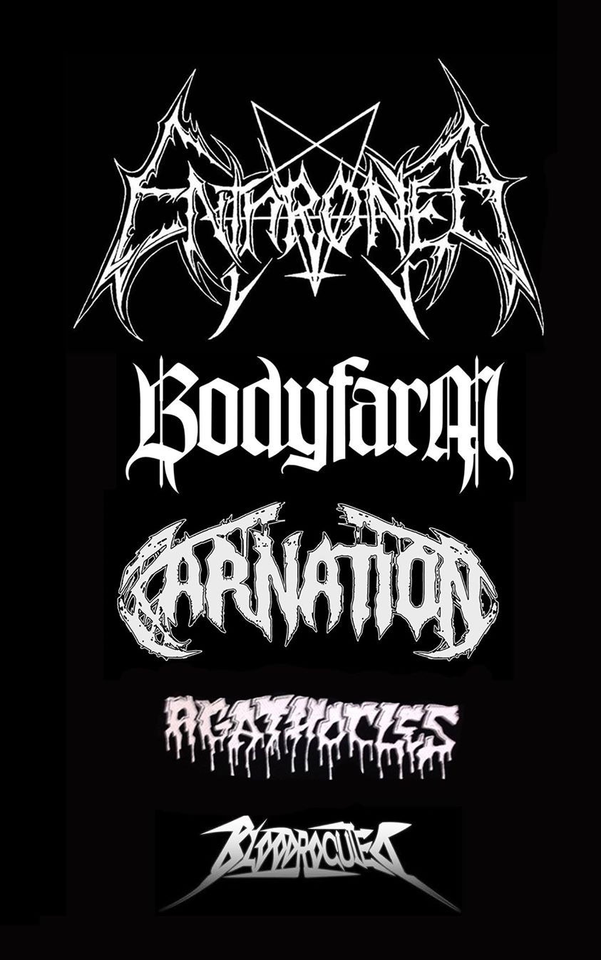 Zaterdag is het, net als vorig jaar, de dag van de 'extreme metalen'. In het Black metal wereldje is Enthroned geen onbekende. Ze werden opgericht medio 1993, en zijn uitgegroeid tot één van de meest legendarische Belgische bands binnen het Black Metal gebeuren. Met internationale alures! Hebben we al gezegd, levende legendes? Dat zijn Enthroned zeker en vast, ze komen nu gewoon naar het gezellige Café Elpee om daar vijf jaar Elpee te komen vieren. Death Metal, the Dutch way! Zo omschrijven de Nederlanders Bodyfarm zichzelf op hun facebook pagina. De band heeft sinds hun ontstaan, medio 2009, al een heel parcours afgelegd. Ondertussen zijn ze zowel in binnen en buitenland uitgegroeid tot een begrip, binnen het Death Metal gebeuren. Maar ook beloftevolle bands uit eigen land krijgen de kans om te spelen op 5 Jaar Elpee. Hoewel ze ondertussen al uitgegroeid zijn tot heel bekende gezichten binnen het genre. Carnation ontstonden in 2013 en brachten met Cemetery Of The Insane een debuut plaat uit waarmee ze bewezen niet te moeten onderdoen voor andere levende legendes binnen het genre. Zowel op als naast het podium worden gensters geslagen, en de duivels ontbonden. Dat kunnen we ook zeggen over Bloodrocuted die met Disaster strikes back één album heeft uitgebracht, dat we in onze eindejaarslijstje zeker zouden onderbrengen in de categorie 'metal plaat van het jaar'. Maar ook op het podium bewezen deze heren uit het goede hout gesneden te zijn. Agathocles is een in 1985 opgerichte Belgische grindcoreband. De band wordt inmiddels gerekend tot de top van belangrijkste grindcore bands uit West-Europa. Maar naast grindcore zijn er ook invloeden van death metal binnen hun muziek. Waardoor ze zeker niet in een hokje geduwd kunnen worden. Gewoon steengoede metal band, met een ondertussen ijzersterke live reputatie. Lijkt ons een betere omschrijving.