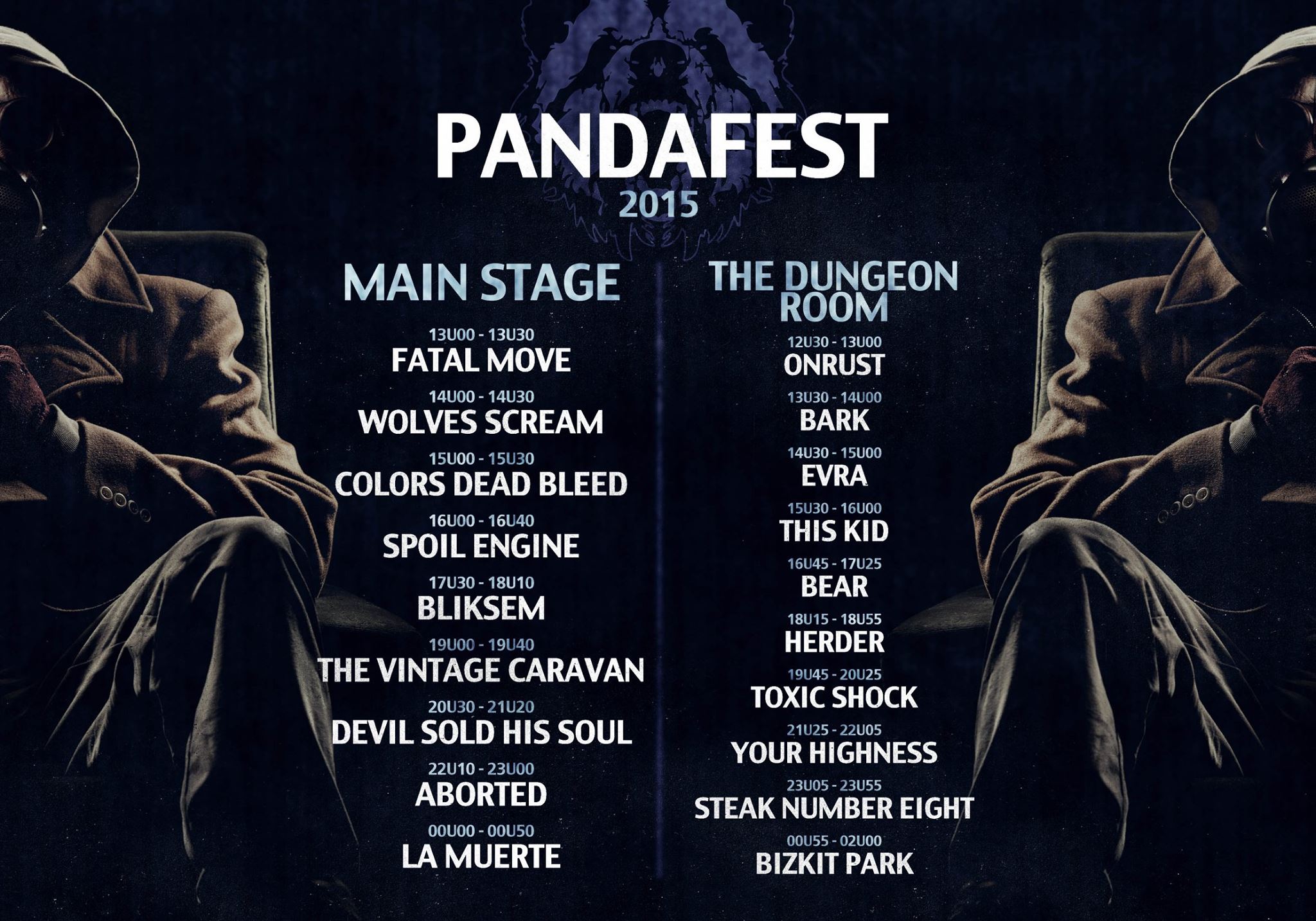 Rocktoberfest, Antwerp Metal Fest , Toxic Waste Fest, Rebelworld Events, het zijn maar een paar voorbeelden van organisaties die het 'underground gebeuren' binnen de hardere alternatieve muziekgenres een warm hart toedragen. Ook Pandafest mogen we aan deze reeks toevoegen, telkens opnieuw wordt een affiche samengesteld met bands en artiesten die in het afgelopen jaar ruimschoots hun sporen hebben verdiend binnen de 'underground scene'. Ook in 2015 is dit het geval. Met BARK, Bliksem, Your Higness, Wolves Scream, The Vintage Caravan, La Muerte, BEAR en vele anderen kregen we een ritst artiesten voorgeschoteld die nog één keer alles op alles wilden zetten om het concertjaar 2015 af te sluiten met een knallend feestje. De opkomst was wederom vrij groot, bovendien heerste er de gehele dag en avond een gemoedelijke en kameraadschappelijke sfeer.