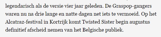 Heb je de show van Twisted Sister gemist afgelopen weekend op Graspop Metal Meeting? Geen nood want ze zakken nog een allerlaatste maal af naar de Kortrijkse weiden. Dat nieuws maakte De Morgen deze ochtend bekend. Er is vanuit de organisatie nog geen officiële bevestiging.