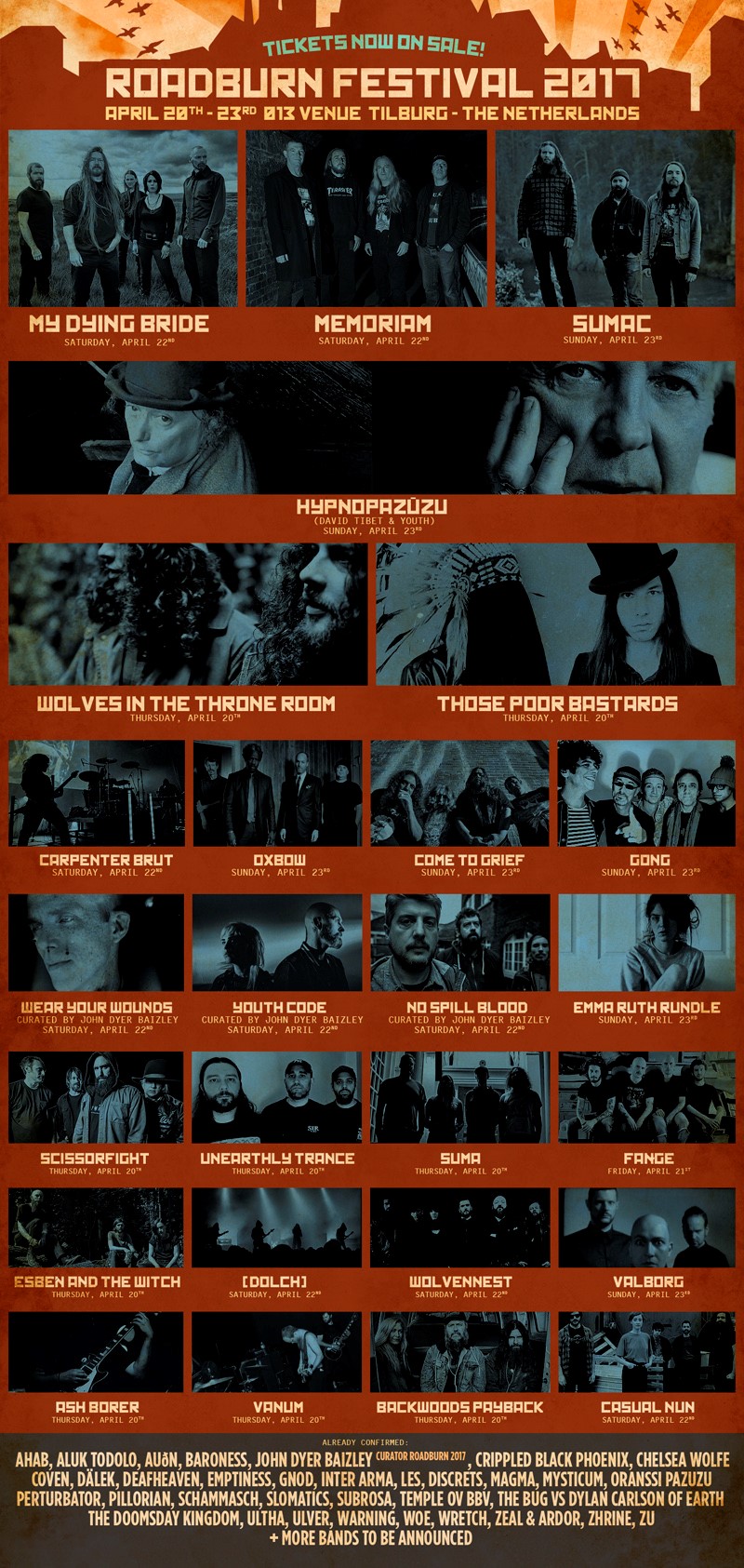 Na twee indrukwekkende lichtingen namen met onder andere BARONESS, de occulte rockpioniers COVEN, het nieuwe project van THE BUG en DYLAN CARLSON van EARTH en exclusieve en unieke shows van MYSTICUM, CHEALSEA WOLFF en MAGMA, maakt Roadburn nu weer een indrukwekkende rij namen bekend. MY DYING BRIDE maakt zijn Roadburn debuut; DAVID TIBET en YOUTH zullen optreden als HYPNOPAZUZU; WOLVES IN THE THRONE ROOM; MEMORIAM; WEAR YOUR WOUNDS; CARPENTER BRUT; THOSE POOR BASTARDS en nog veel meer. De ticketverkoop is reeds gestart.