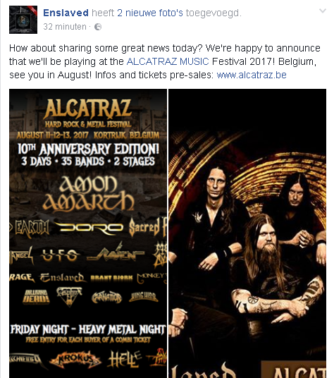Wat als een band eerder was dan de organisatie. Gisteren bevestigde Saxon al tijdens hen show in Trix en zonet releasede Enslaved de officiële affiche voor Alcatraz Hard Rock & Metal Festival: 2017. Hier is 'm dan ...
