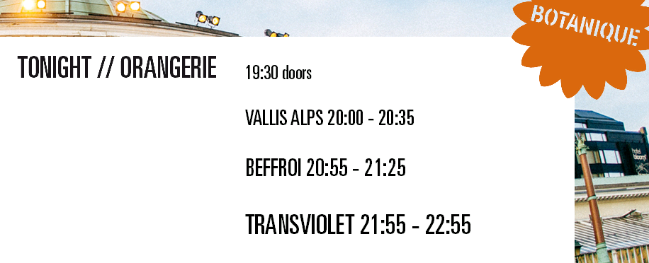 Dames aan de macht op deze zaterdagavond, dat was wel duidelijk. We sloten af met een streepje Synthpop met Transviolet. Het sombere en geschifte zusje van Lana Del Ray'' zo wordt zangeres Sarah McTaggart omschreven. Met de single New Bohemia gooiden Transviolet reeds hoge ogen. Ook op het podium bleek deze band, andermaal, heel aanstekelijke synthpop naar voor te brengen. In bepaalde mate deed de act van Transviolet ons ook wat denken aan Beverly die we eerder bezig zagen in Rotonde. In elk geval blijken ze met dezelfde uitstraling op het podium te staan, ook al ligt hun muziek wellicht niet in dezelfde verlengde. Naast het podium blijkt Sarah de rust zelf, maar op het podium lijkt wel of demonen worden ontbonden. Wild om zich heen slaande, trok ze dan ook de meeste aandacht naar zich toe. Maar ook hier viel het op hoe strak en gepolijst de instrumentalisten stonden te spelen. Transviolet laten vooral een frisse wind waaien doorheen het aanbod van synthpop tot aanverwante muziekstijlen. De hoge toegankelijkheid waarde van hun muziek, zorgt er ook voor dat wederom een ruim publiek zou overslag moeten gaan. De opkomst was echter niet zo groot, al kunnen we toch stellen dat de Orangerie goed gevuld was. Maar deze band staat aan het begin van hun carrière en lijken, gezien hun sterke prestatie op het podium van nuits botanique toch een band om in het oog te houden. Niet alleen stralen ze een zekere spontaniteit tot spelplezier uit, ze brengen heel aanstekelijke synthpop waarop stil staan ook weer eens onmogelijk blijkt te zijn. Net als bij eerder genoemde Beverly zijn er uiteraard nog heel veel groeimogelijkheden, het is niet zo dat we hier het nieuwste wereldwonder hebben ontdekt. Maar net zoals bij die eerder genoemde band, beschikt Transviolet over een uitstraling en potentieel om heel ver te geraken. Net door het aanbrengen van heel toegankelijke synhtpop, met een spontaniteit die harten raakt. Ziet de toekomst voor Transviolet er heel rooskleurig uit.