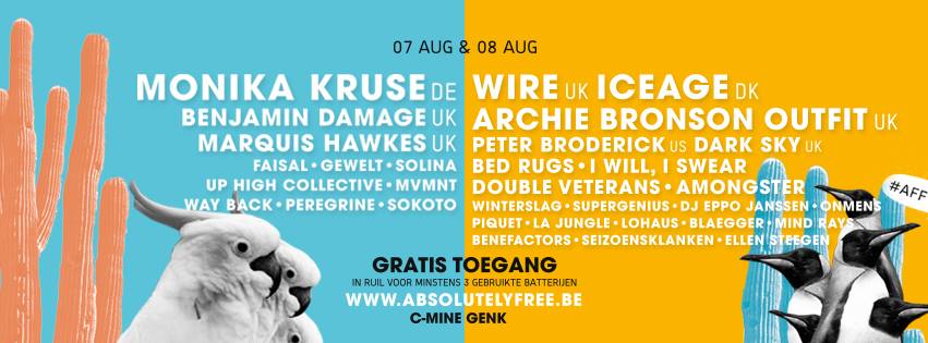 Absolutely Free Festival, ook kortweg AFF genoemd, gaat door op 7 en 8 augustus. Dit in C-Mine te Genk. Met o.a. Archie Bronson Outfit, Peter Broderick, Wire en Monika Kruse werd weer een heel sterke affiche samengesteld. Ondertussen laat de organisatie weten dat deze compleet is, met de toevoeging van de laatste reeks namen.