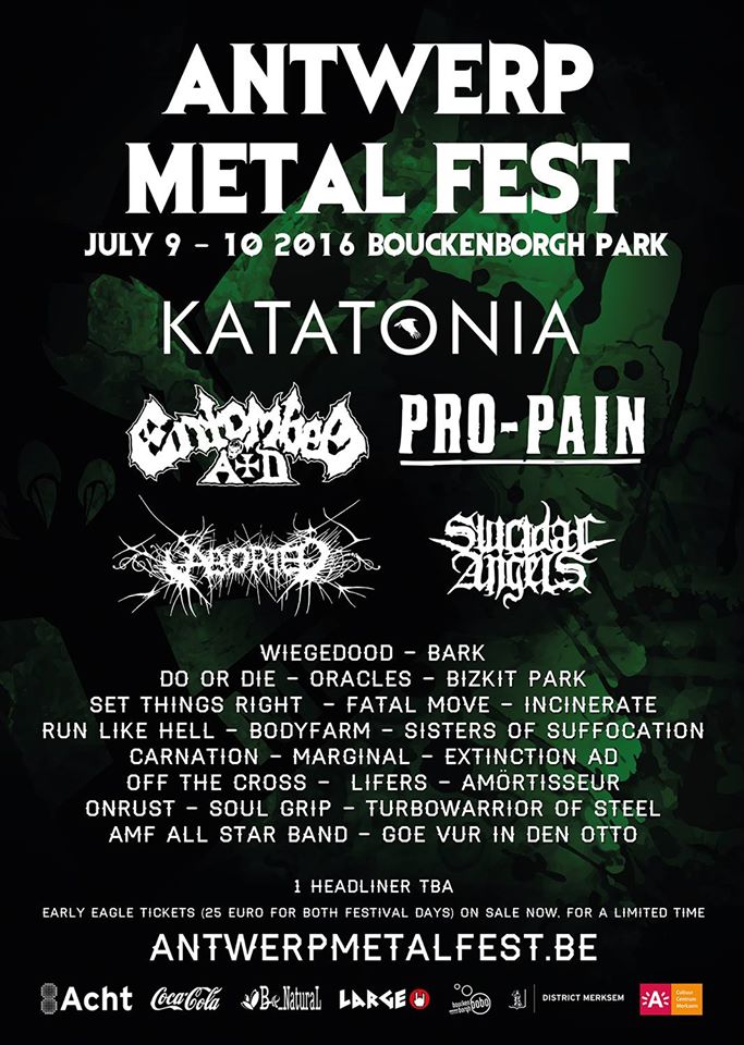"Nieuwe namen Antwerp Metal Fest. Onze affiche is nu rond, met één uitzondering van één grote headliner, die we over een maand bekendmaken. Je kan nog gedurende beperkte tijd je combitickets aan early eagle-tarief kopen: 25 euro voor het hele festival, via antwerpmetalfest.be."
