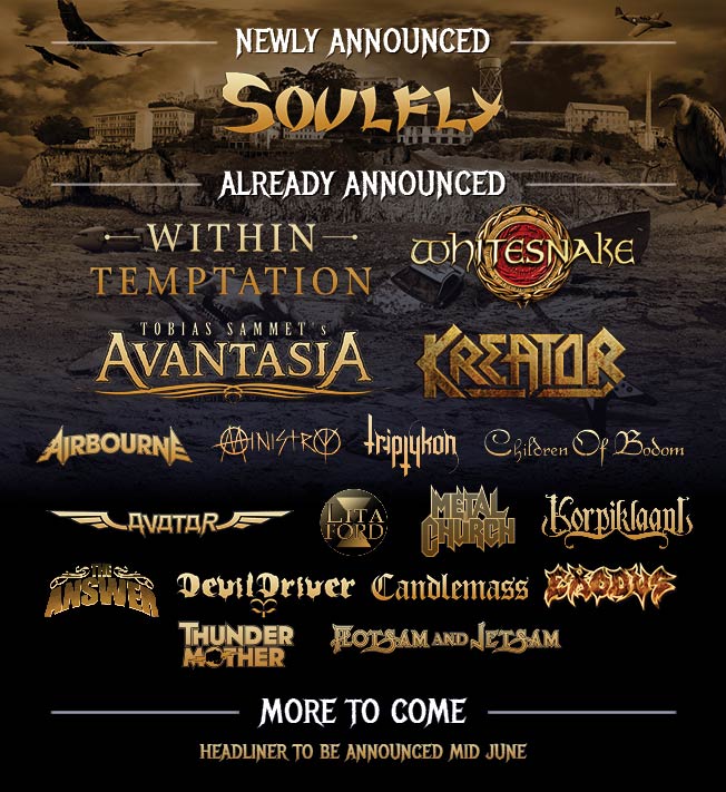 WITHIN TEMPTATION, MINISTRY, CHILDREN OF BODOM, DEVILDRIVER, AIRBOURNE, FLOTSAM AND JETSAM, METAL CHURCH, KORPIKLAANI, WHITESNAKE, CANDLEMASS, TRIPTYKON, AVANTASIA, KREATOR, AVATAR, EXODUS, THE ANSWER, THUNDERMOTHER en LITA FORD.