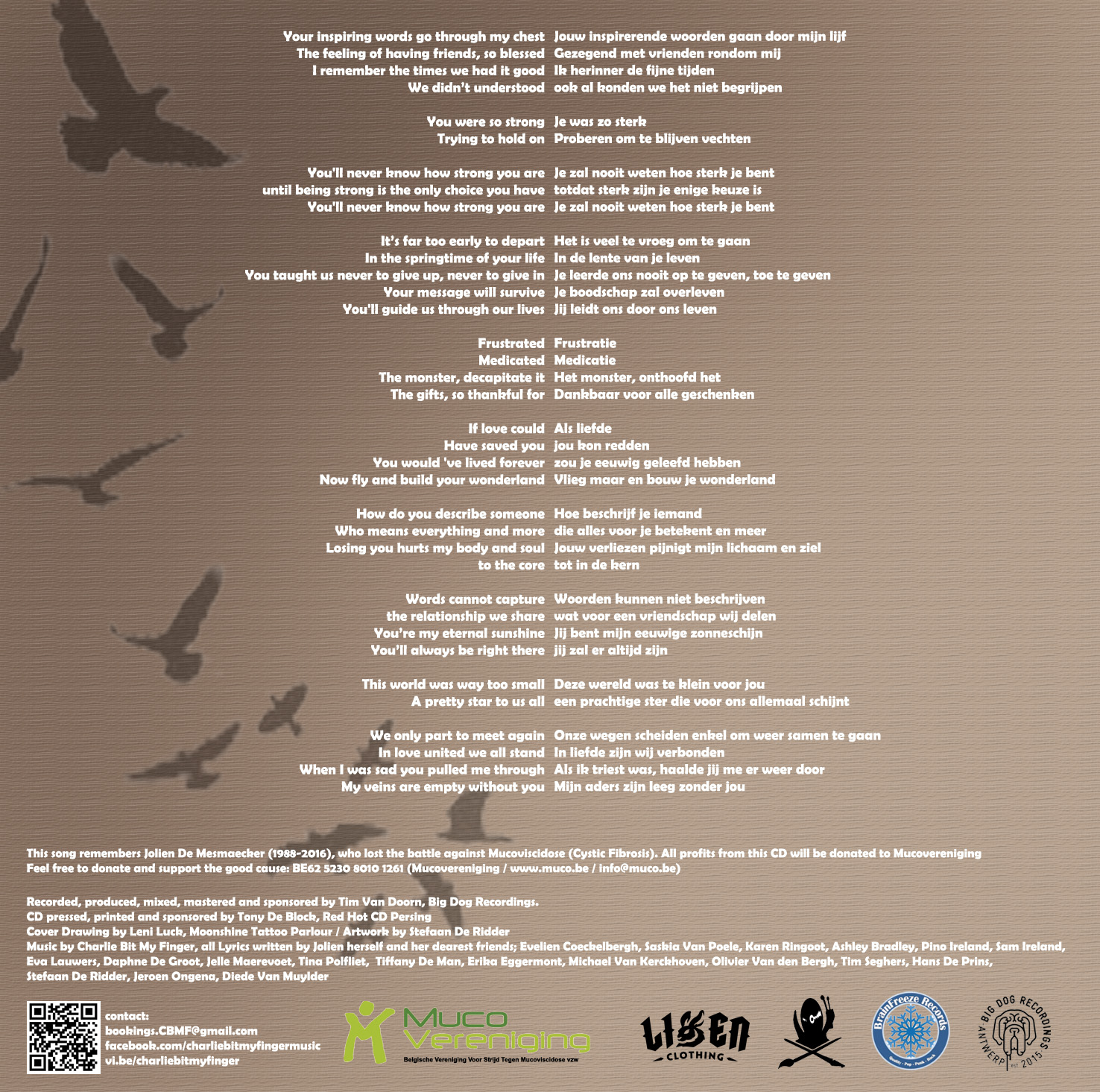 Dit liet Stefaan de Ridder, gitarist bij Charlie Bit My Finger, ons in een gesprek weten. De tekst van deze song - die jullie hieronder kunnen lezen - is trouwens geschreven door alle vrienden en vriendinnen ter nagedachtenis van Jolien De Mesmaecker.