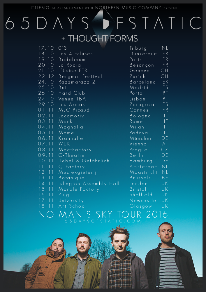 We're VERY pleased to tell you that we'll be back on the road soon, joining 65daysofstatic on a massive tour across Europe! Dit krijgen we te lezen op de facebook pagina van Thought Forms. Reeds in 2014 mocht deze begenadigde band in AB te Brussel in het voorprogramma staan van 65daysofstatic. Ook in het najaar van 2016 is dit het geval. Zo zullen ze ook te zien zijn in Botanique op zondag 13 november.