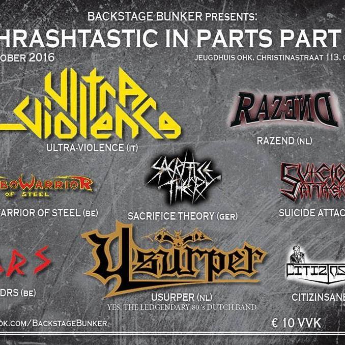 Legendary underground dutch thrashmetal/ Zo worden de Nederlandse band Usurper omschreven op de facebookpagina van het evenement thrashtastic in parts part 2. Usurper gooiden reeds in de jaren '80 hoge ogen. Ze ging o.a. op tour met bands als Paradise Lost en Autopsy. Ze worden gezien als één van de eerste thrash metal acts in Nederland, en zijn - na 26 jaar - terug volop aan een tournee bezig.USURPER maakte 2 demo's waarmee ze gestaag groeide in de steeds groter wordende extreme metal scene in Nederland en Europa. Geweldige recenties in talloze underground bladen overal ter wereld zorgde ervoor dat USURPER opgemerkt werd door platenmaatschappijen. USURPER's 'Divine Spiritual and Intellectual Development' kan dus gezien worden als 1 van de eerste underground thrash metal releases in Nederland. De stelling 'legendarisch' is dus zeker niet gelogen, als we alle berichten over deze Nederlanders lezen. op vrijdag 2 september speelden de heren een reünie optreden in de Vlaardingse Kroepoekfabriek. Daaruit bleek dat hun klassieker Divine Spiritual and Intellectual Development nog niets van zijn oude vurigheid heeft verloren, integendeel. Zonder meer, dit zal een gedenkwaardig concert worden, voor in de geschiedenisboeken van het Thrash metal gebeuren. En dit in Oostende, op 29 oktober.
