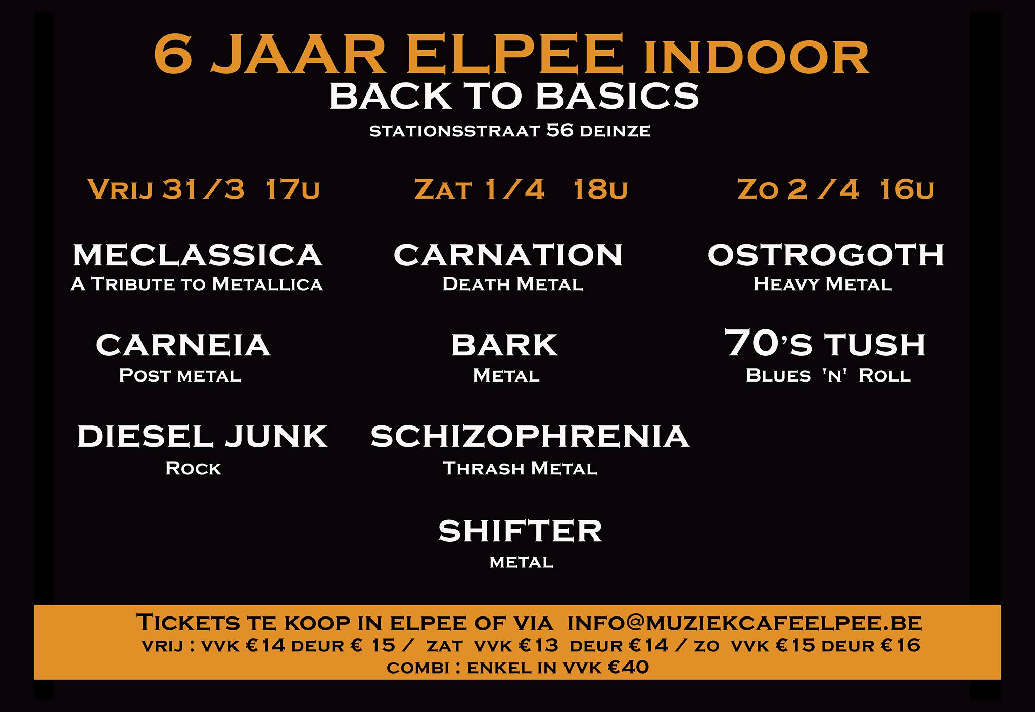 Dag twee is naar goede gewoonte de dag van loeiende gitaren, knallende drums en vocalen die muren omver blazen. Kortom, het hardere en vaak extremere metal geweld komt aan bod op deze tweede festivaldag van 6 jaar ELPEE. Shifter - omschreven als : Fast – Heavy – Melodic – Angry - Adverse ! zetten alvast de toon. Schizophrenia zijn een jonge, ambitieuze Belgische thrash metal band. Die goed op weg zijn om door te breken, tot ver buiten de landsgrenzen. Mis ze daarom niet in de intieme omgeving die Café ELPEE zo magisch maakt. Nog zo een Belgische band die ondertussen hoge ogen heeft gegooid, en Live een beleving op zich kan genoemd worden. BARK, de Antwerpse Metal trots. Carnation brengen een portie old school death metal van eenzaam hoog niveau. Kortom, het dak gaat er gegarandeerd afgaan op deze zaterdag!