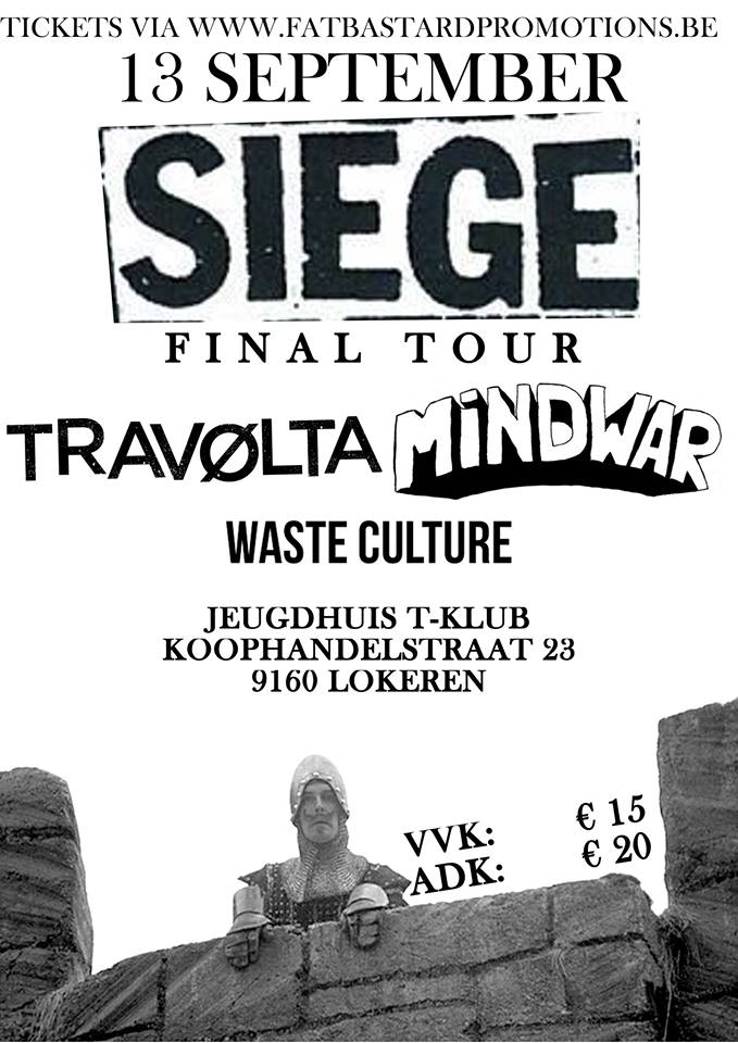 Nog geen plannen voor woensdag 13 september? In T-Klub te Lokeren gaat een evenement door waarvan de doorsnee metal, punk en hardcore fanaat gewoon zou moeten beginnen watertanden. Met Siege (US, Final Tour) /Mindwar/Travølta/Waste Culture kan de avond gewoon niet stuk. En dit allemaal voor de prijs van amper 15 euro in voorverkoop en 20 euro aan de kassa.