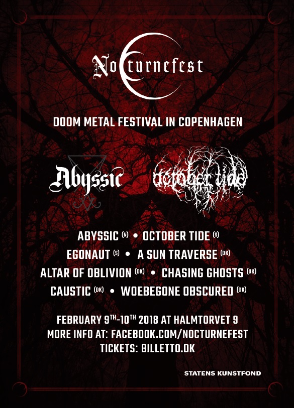 Vandaag nog gelezen, de hypes voor 2018 komen o.a. uit de Scandinavische landen. Dit in grote mate door Streaming via Spotify en dergelijke meer. Waardoor artiesten over de gehele wereld door de muziekliefhebbers en fans veel gemakkelijker worden opgevangen. Dit geheel terzijde. Ook wat festivals betreft is de wereld nog nooit zo klein geweest als nu. In Denemarken gaat bijvoorbeeld een heel interessant festival door waar de doorsnee Doom metal liefhebber aan zijn of haar trekken zou moeten komen. Dit op 9 en 10 februari. Onder de naam: Nocturnefest. De affiche is sinds gisteren compleet. Tijd voor een overzicht: