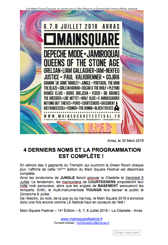 Met mondjesmaat werd de affiche van Main Square festival, dat doorgaat op 6, 7 en 8 juli. Opgevuld. Met de toevoeging van de vier laatste namen is de affiche nu compleet. De veertiende editie van Main Square Festival gaat naar goede gewoonte weer door Citadelle d'Arras (Frankrijk).