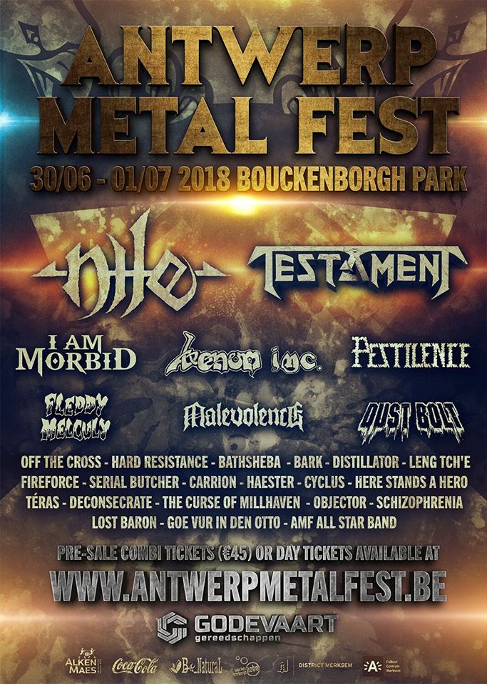 Het was nog even wachten op de laatste bevestigingen. Maar enkele uren geleden liet de organisatie weten dat de line-up voor Antwerp Metal Fest 2018 compleet is. We citeren het facebook bericht op de pagina van het evenement: ''Naast de eerder bekendgemaakte headliner Testament (zondag 1 juli) zetten we de Amerikaanse death metal-legende NILE. Nieuwe subheadliners: VENOM INC. en I AM MORBID.'' Antwerp Metal Fest gaat door op zaterdag 31 juni en zondag 1 juli BOUCKENBORGH PARK - Bredabaan 559 - 2170 Merksem.